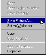 Find the image you want to save and place your cursor over it. Click the right mouse button to open a menu similar to the one shown here. Select Save Picture As with your left mouse button and choose the directory on your drive where you want the image stored. |