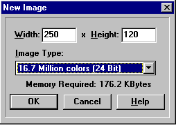 Select File - New from the menu bar. In the New Image Control Panel, set the width of the image to 250 pixels and the height to 120 pixels. Make sure your Image Type is set at 16.7 Million Colors, then select OK. |