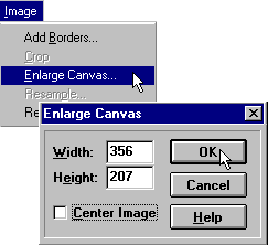 | Enlarge the image canvas by selecting Image - Enlarge Canvas from the menu bar. Set the width to 356 pixels and the height to 207 pixels, doubling the size of the canvas. Do not check the Center Image box. We want the badge positioned to one side of the canvas so we can work on the other side. |