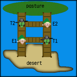 A cow, a bear, and a goat leave the dry desert and head for the lush pasture across the water. No animal can pass an elf or troll more than once. Each animal wants to get to the pasture in the same shape as he or she left the desert if possible, and prefers life over death. Each animal will take the shortest route possible, given those goals.