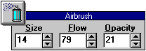 | Select a foreground colour that will go well with the base colour of the letters. Double-click the Airbrush to open its control panel. Set the properties of the Airbrush tool as shown. Paint the insides of the letters with the new colour. Notice how the mouse button is like the button of a spray can. The longer you hold the mouse button down, the more paint you release. |