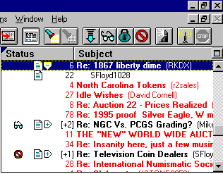 As you can see, a news reader program can make cyberlife a whole lot easier by helping you keep on top of all those Usenet newsgroups. Another very useful feature that news readers have is tracking and organizing threads of discussion. Threads are groups of related articles on similar subjects within a newsgroup. With the kind of megatraffic that passes through a popular newsgroup, threads are very important. Threads can help eliminate some of the noise by separating the discussions you do want to read from those you don't want to read.